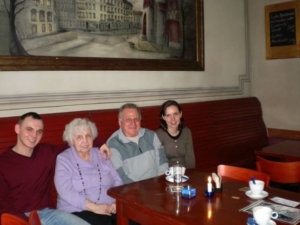 Another was Eveline Grasse (maiden name: Haucke), her grand-daughter Katja Stettin and her grand-son Matthias Bergmann. Eveline, 80 years old at the time, went to school with Ingeborg Silberberg [a cousin of my mother – Paula Silberberg’s (Lewin) daughter], and was her best friend. One day in 1938 Ingeborg disappeared (they were 8 years old) and she never heard from her again. Years later she found out what the Nazis did to the Jews, but hoped Ingeborg somehow survived. Her grand-children Katja and Matthias did a Google search and found my Family Tree website, where they learned about Ingeborg’s fate. Katja contacted me and I met the three of them in the neighborhood in Berlin where Eveline and Ingeborg spent their early childhood years.