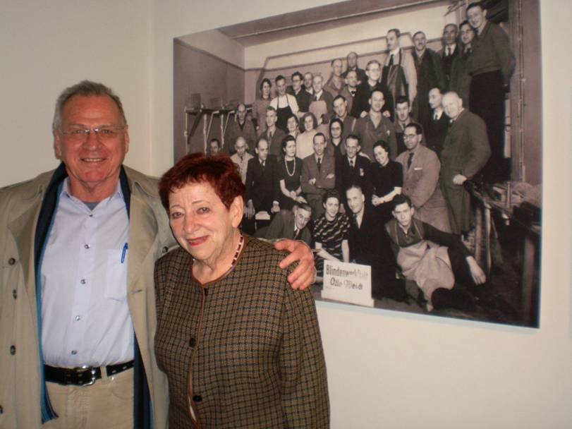 As I was browsing the books there, my eyes fell on a small grey museum catalogue with a picture on the cover; in it I recognized my mother’s uncle Siegfried (Sigi) in a group with other blind persons around Otto Weidt! It was too late for me to visit the museum on that trip, but before I got to Berlin in 2009, I wrote the museum, telling them who I was and that I was interested in visiting and finding out about Siegfried Lewin. The staff of the museum was happy to meet a relative of one of the people they displayed at the museum, and Kai Gruzdz, the researcher, arranged for me to meet Inge Deutschkron.